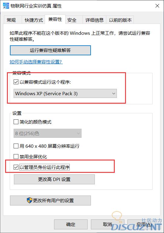 解决方法为:在物联网行业实训仿真系统处右击-->选择属性-->找到兼容性,勾选以兼容模式运行这个程序、以管理员身份运行程序即可解决。